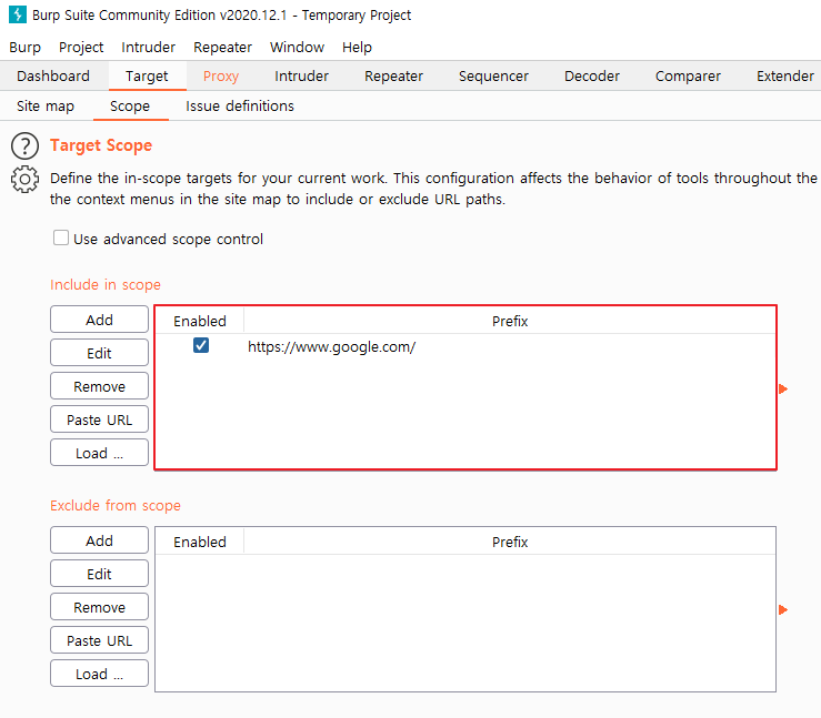 이 메뉴에서 말하는 target scope는 Burp suite의 Target - Scope 에서 추가할 수 있다. 해당 메뉴에서 수동으로 추가해줘도 되고, Target - Site map 에서 마우스 우클릭으로 추가해줘도 된다.