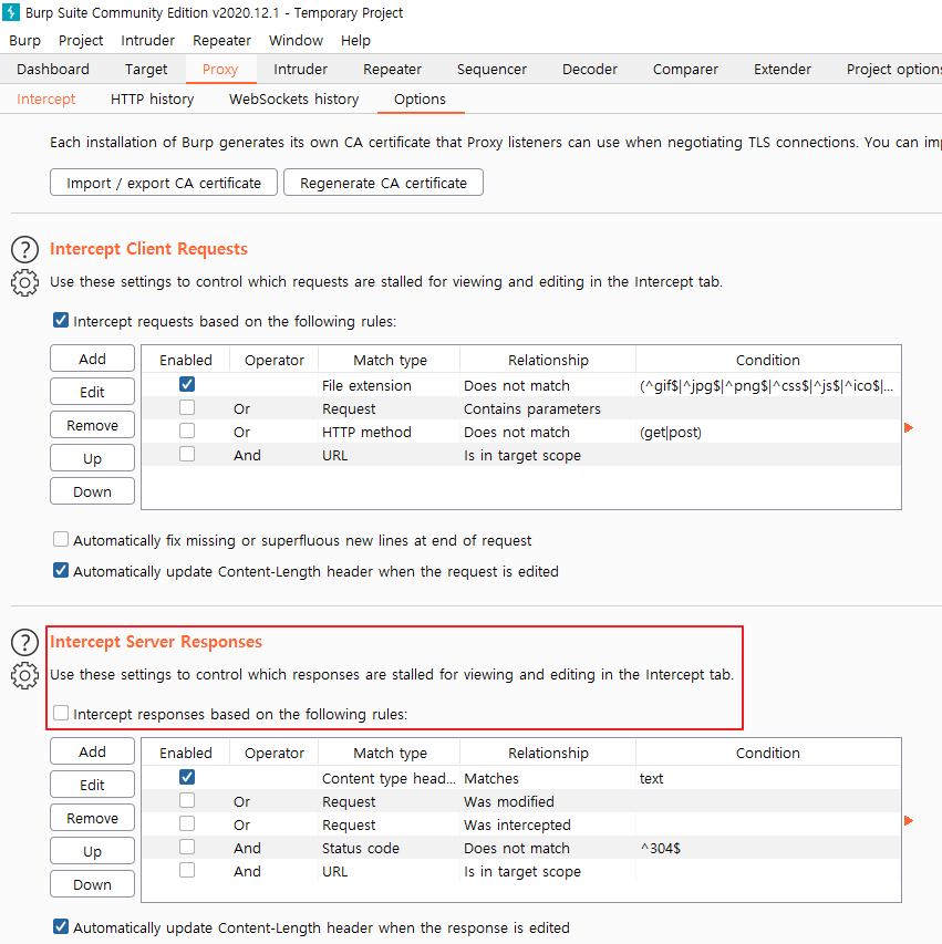지금까지의 내용을 직접 진행해봤다면 알 수 있듯이 Burp suite는 기본적으로는 HTTP Request에 대한 내용만 캡처해준다. 이는 아래와 같이 Server Responses 설정이 되어 있지 않기 때문이다.