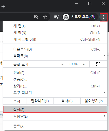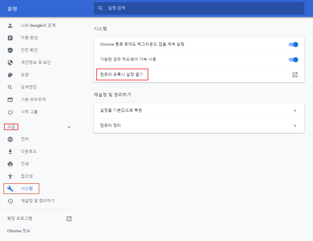 이제 Burp suite에서 127.0.0.1:8080 에 대한 Proxy를 받아줄 수 있는 환경 설정이 되었으니, 이제 브라우저에서 웹 트래픽을 127.0.0.1:8080 으로 Proxy 해주는 설정을 해줘야된다. 필자는 Chrome에서 Proxy 설정을 변경할 예정이다. 브라우저 마다 조금씩 메뉴 차이는 있지만 거의 비슷비슷하다.