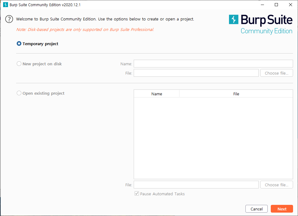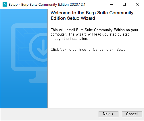 다운로드 받은 burpsuite_community_windows-x64_v2020_12_1.exe를 설치한다. 설치 과정에서 어려운 것은 없고 Next > Next > Next .... 를 누르기만 하면 설치가 완료된다.