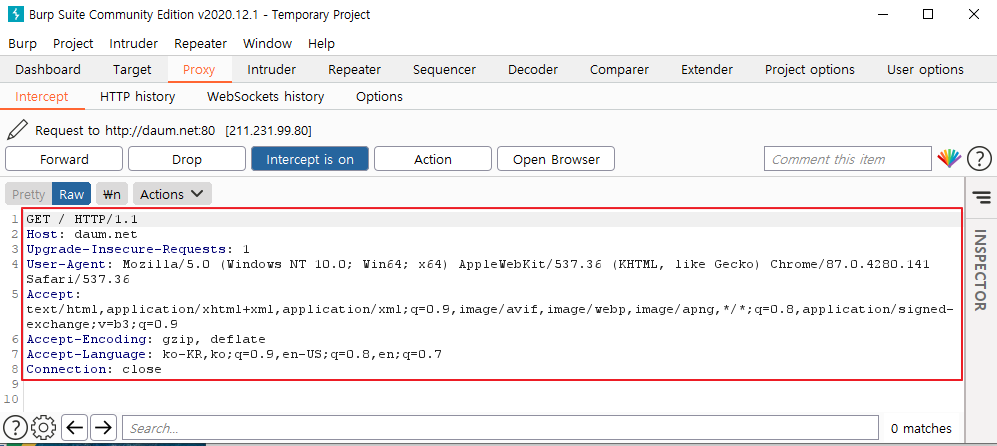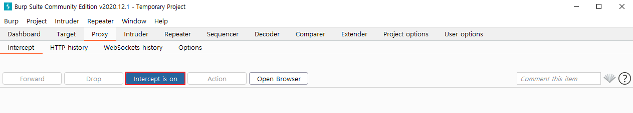이제 Proxy Intercept에 대한 준비는 됐다. 잘되는지 확인해보기 위해 Intercept 상태를 Intercept is on 으로 변경한다.