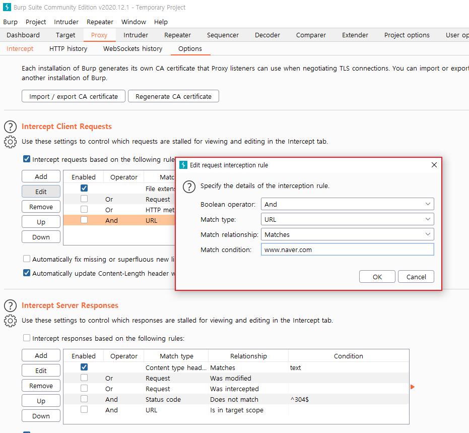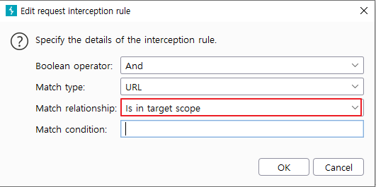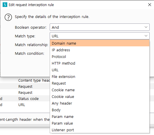 Burp suite 기본 설정으로는 크롬에서 접속을 시도하는 모든 내용을 다 캡처한다. 이로 인해 사용자가 원하지 않는 불필요한 내용도 모두 캡처되는데,,, 이는 굉장히 짜증나는 일이다. 그래서 내가 필요한 내용만 설정할 수 있는 기능을 소개한다. 아래 캡쳐에서 볼 수 있듯이 Intercept 조건을 추가하거나 이미 있는 조건을 Edit 하면 상세 설정을 할 수 있는 팝업이 뜬다. 도메인, 프로토콜, HTTP 메소드, 파일 확장자, 파라미터 존재 유/무 등등 여러가지 조건을 추가할 수 있다. 이 내용들을 적절히 조합해서 사용자가 원하는 내용을 캡처할 수 있도록 사용하면 된다.