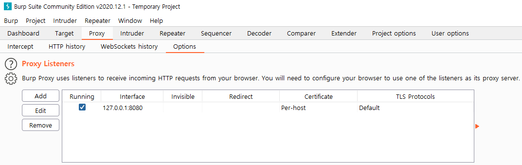 Burp suite를 설치하면 기본적으로 127.0.0.1:8080(Localhost)에 대한 프록시 요청을 받기 위한 Proxy Listeners 설정이 추가되어 있다. 해당 설정을 변경하거나 새로운 Proxy Listeners 설정을 추가할 수 있긴하지만, 당분간의 테스트 환경에서는 별도로 수정할 일이 없을 것으로 보인다.