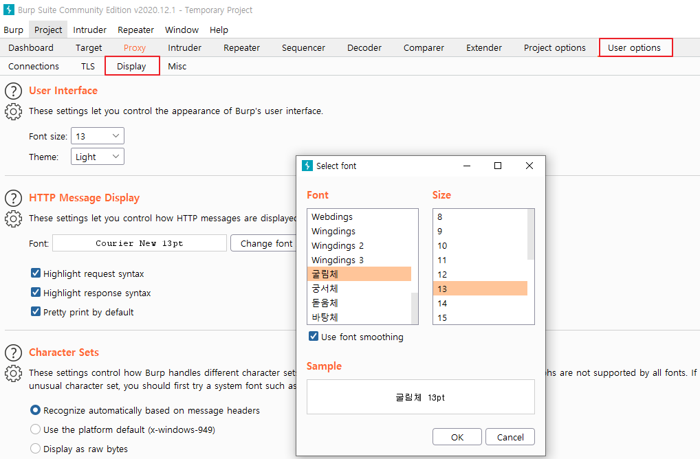캡쳐하는 내용에 한글이 있을 경우, 깨져서 패킷이 캡처되는 경우가 있다. 한글을 깨지지 않게 하기 위해 아래와 같이 User options - Display 에서 한글 폰트를 선택해주자.