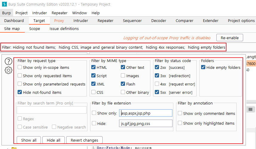 Scope와는 별도로 Burpsuite에는 툴에 보여주는 내용에 대한 Filter 설정도 할 수 있다. 아래 화면의 Filter 부분을 클릭하면 설정할 수 있는 메뉴가 나온다. (Target, Proxy 모두 Filter 메뉴가 있고 내용이 조금씩 다르니 참고.)