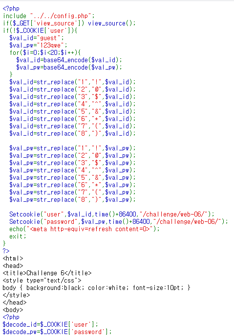 코드 끝 부분에 decode, decode_pw부터 거꾸로 올라가면 결국 admin과 nimda를 디코딩, 문자열 치환 후 쿠키값에 넣어주면 문제가 해결된다는 것을 알 수 있다.