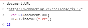 indexOf() 메서드는 배열에서 지정된 요소가 위치한 첫 번째의 인덱스를 반환하고 존재하지 않으면 -1을 반환한다. 문제에선 document.URL 중 .kr이 시작한 위치인 인덱스인 18을 반환한다.