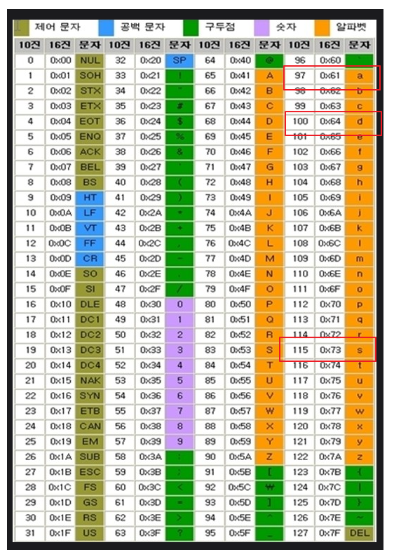 100, 97, 115... 가 있는거 보니 아스키코드인 것 같아서 확인해보니 예전 콘솔게임할때 자주쓰던 방향이인 asdw 등등이다.