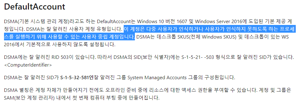 잠시 docs.microsoft.com/ko-kr/windows/security/identity-protection/access-control/local-accounts#defaultaccount 를 빌려 설명하자면, 각 항목은 아래와 같다.