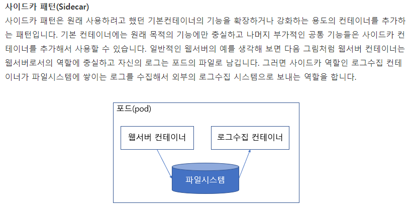 그리고 파드는 크게 2가지 방식으로 나눌 수 있는데, '단일 컨테이너를 실행하는 파드'와 함께 작용해야 하는 '여러 컨테이너를 실행하는 파드'로 나눌 수 있다. 후자의 경우, 함께 배치된 컨테이너는 하나의 결합된 서비스 단위를 형성한다. 예를 들어, 하나의 컨테이너는 공유 볼륨에 저장된 데이터를 퍼블릭에 제공하는 반면, 별도의 사이드카 컨테이너는 해당 파일을 새로 고치거나 업데이트한다. 파드는 이러한 컨테이너, 스토리지 리소스, 임시 네트워크 ID를 단일 단위로 함께 래핑한다.