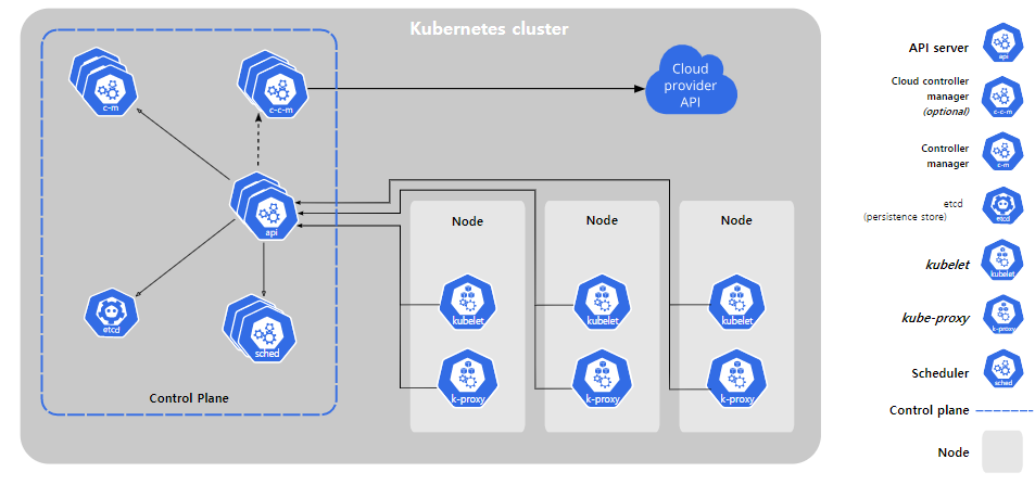 여기서 다신 쿠버네티스의 아키텍쳐로 잠시 돌아가자면, 쿠버네티스는 하나의 마스터 노드와 여러대의 워커노드들이 하나의 클러스터를 이루고 있는 구조이다. 마스터 노드란 API를 통해 클러스터 전체를 컨트롤 하는 것이며, 워커노드는 마스터의 명령에 의해 워크로드를 생성하고 서비스하는 컴포넌트이다. 아래 그림의 컨트롤 플레인을 마스터 노드라고 보면되고, 노드를 워커노드라고 보면 된다.
