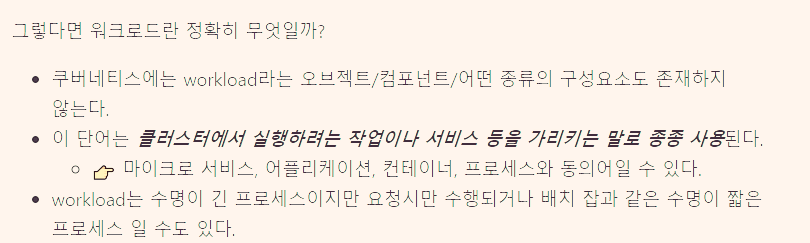 공식 문서에 따르면 워크로드는 쿠버네티스에서 구동되는 애플리케이션이라고 한다. 역시나 공식 가이드는 한번에 알아듣기 힘들다. 그래서 구글링하다 다음의 블로그에서 아래 내용을 봤는데, 어느정도 이해가 가는 것 같아서 퍼왔다. (https://velog.io/@hanblueblue/%EC%BF%A0%EB%B2%84%EB%84%A4%ED%8B%B0%EC%8A%A4-2.-%EC%9B%8C%ED%81%AC%EB%A1%9C%EB%93%9C-%ED%8C%8C%EB%93%9C)