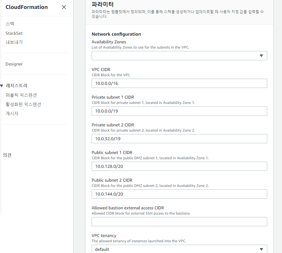 이후 리전을 선택하고, 클라우드포메이션의 상세 옵션들은 설정한다.